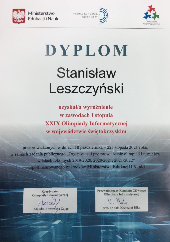 Uczeń klasy 3Tib Stanisław Leszczyński został wyróżniony przez Komitet Główny w zawodach I stopnia XXIX Olimpiady Informatycznej. Stanisław był w gronie dziesięciu najlepszych uczniów w województwie świętokrzyskim.
