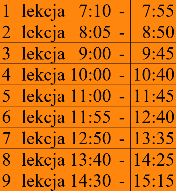 Lekcja | Poniedziałek | Wtorek | Środa | Czwartek | Piątek |